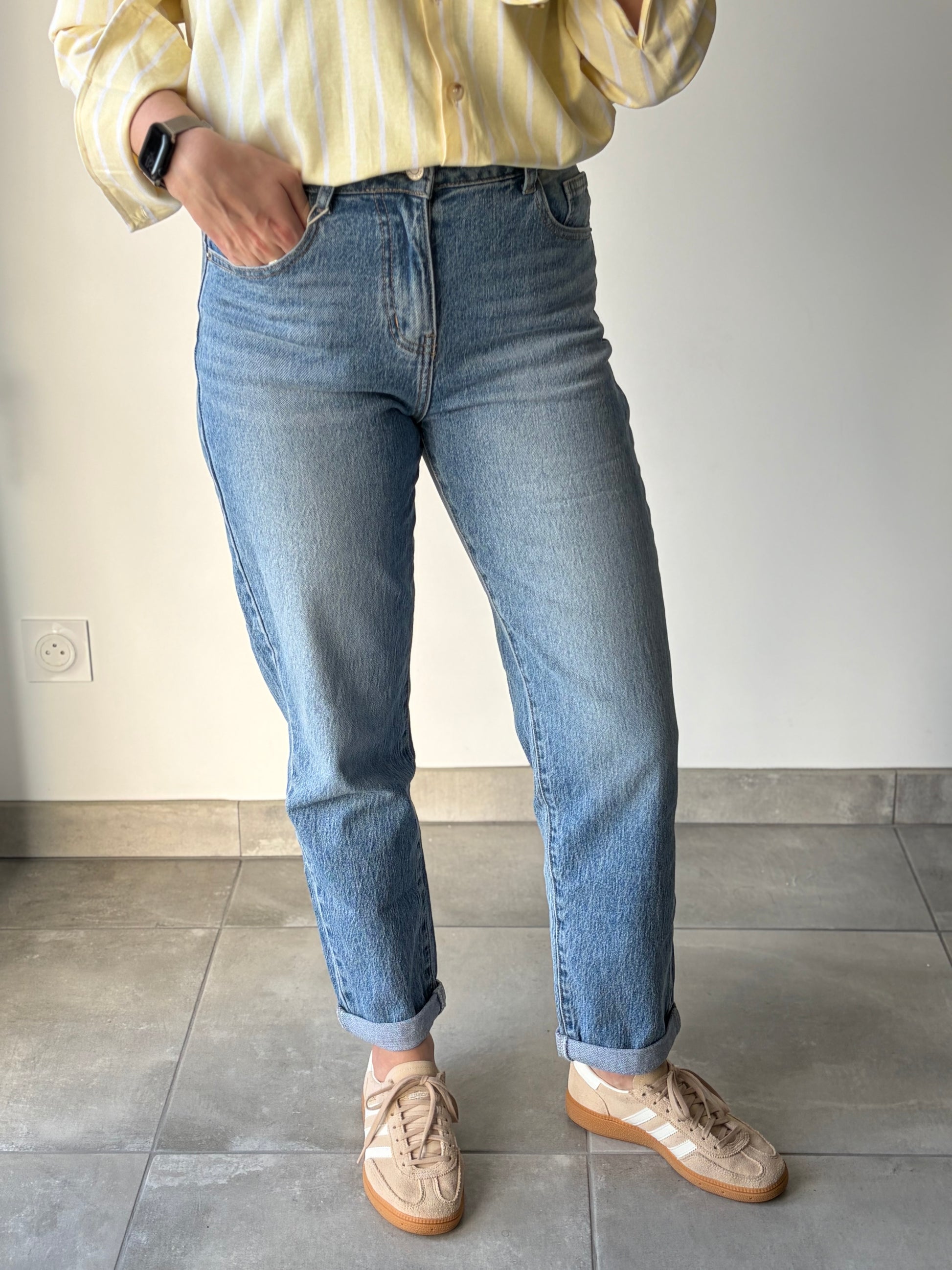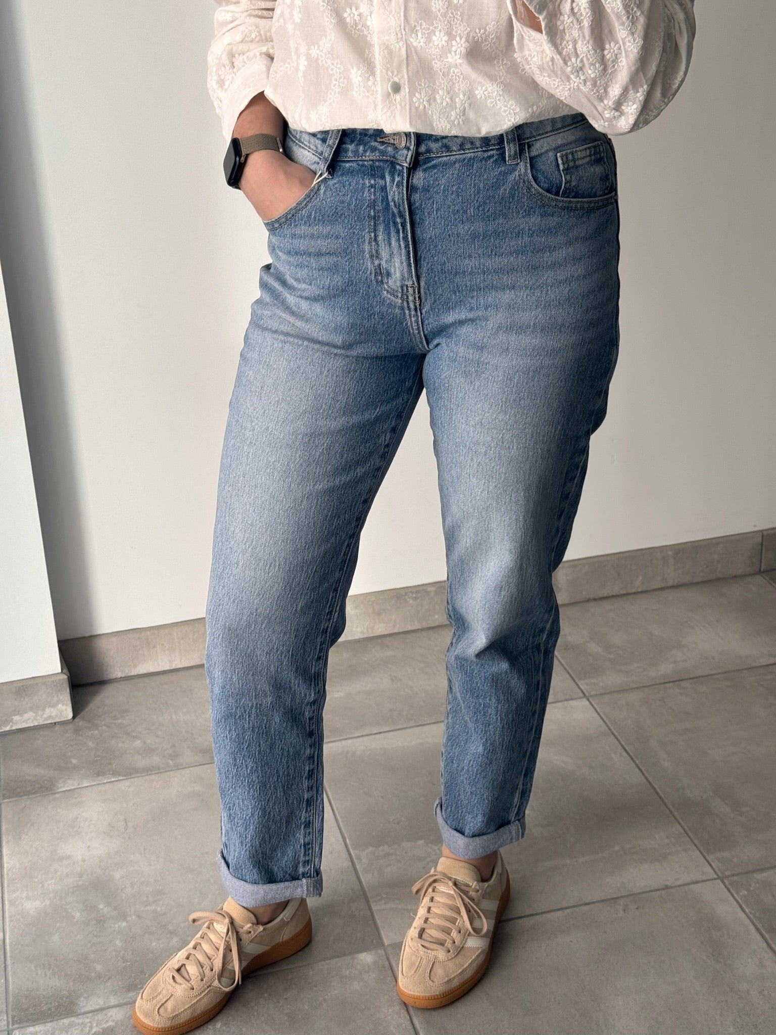 Jean mom au style intemporel, parfait pour un look tendance et confortable au quotidien. Sa coupe légèrement ample au niveau des hanches et resserrée aux chevilles met en valeur la silhouette tout en assurant un excellent confort.